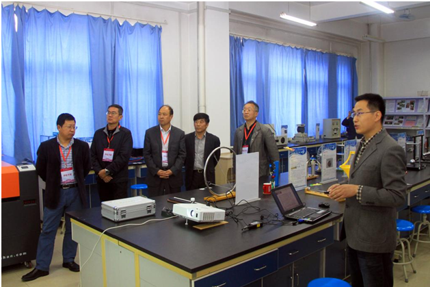 专家组一行首先来到演示实验室进行参观考察,中心主任刘枝朋向专家组详细介绍了物理实验中心的团队队伍、课程体系、教学特色以及社会服务等方面的情况。王建廷副董事长结合中心自制演示仪器的教学特色,就中心研制的便携式波动光学演示仪器获得市级教学成果一等奖等获奖情况向专家组做了重点汇报。随后专家组参观了力学和光学实验室,检查了实验室运行记录并详细了解了大学物理实验教学的相关情况。