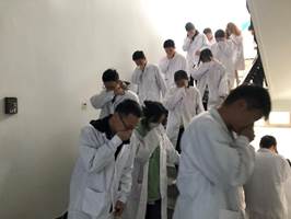 10月29日,永利集团3044化学实验中心举办实验室开放日活动,2021级本科生积极参加。在活动中,化学实验中心主任张杰向同学们介绍了每间实验室,特别讲解了实验室突发安全事故的逃生方法与技能,同时明确了安全出口、洗眼器、喷淋器等的具体位置,强化对新生的安全意识教育,引导规范安全行为。